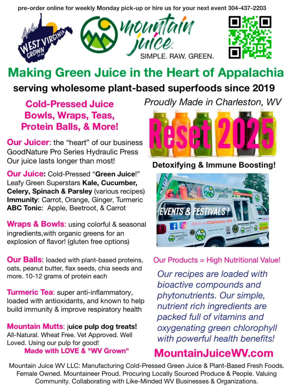 We make it easy! Add some local flare and plant-based fare to your next event. We customize our menu to work for you. Bowls, wraps, & cold-pressed juice - or our grilled smart dog spread, with an array of gourmet toppings - whatever you decide, our truck adds flavor to any affair. Call or text Lisa 304-437-2203 plant based menu