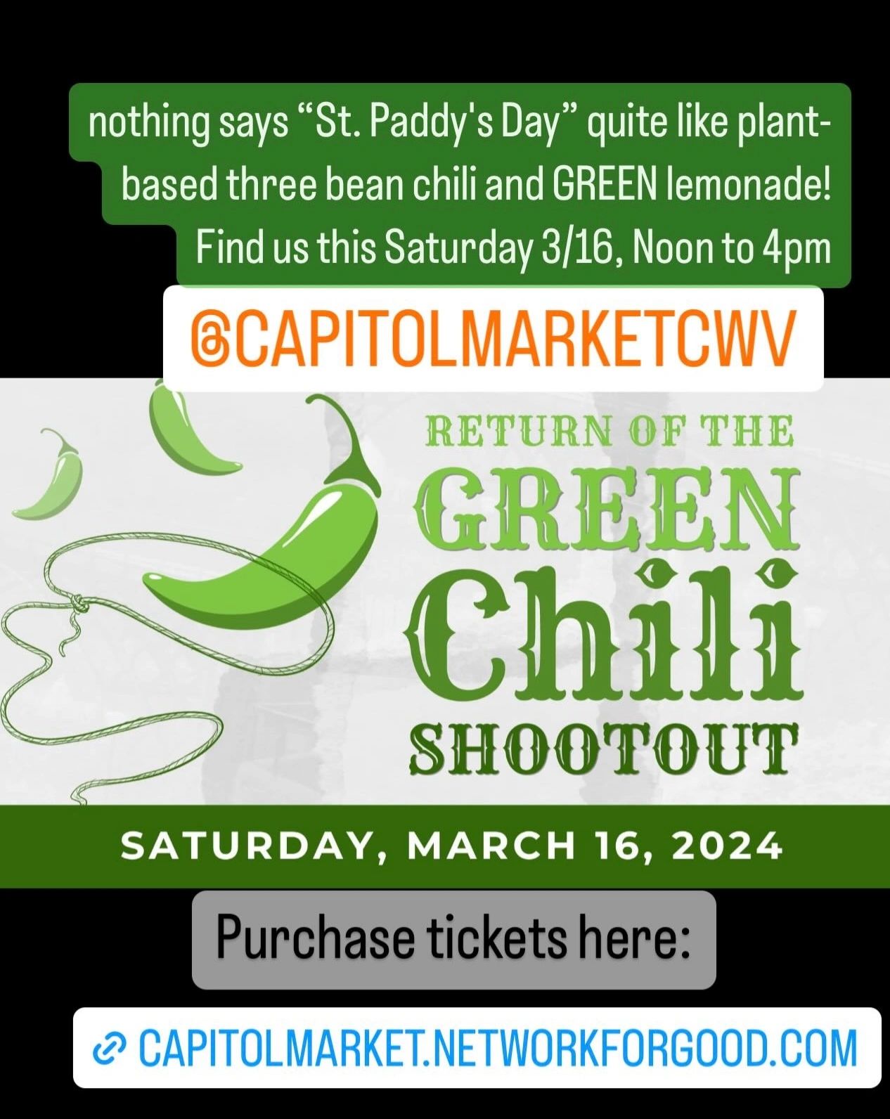 Join us this Sat 3/16! Capitol Market, 800 Smith Street: Our nutritious chili recipe has won 1st place against many non-vegan contenders! Loaded with protein & fiber, you wonβt be disappointed! Big White Van - serving Green Lemonade too!